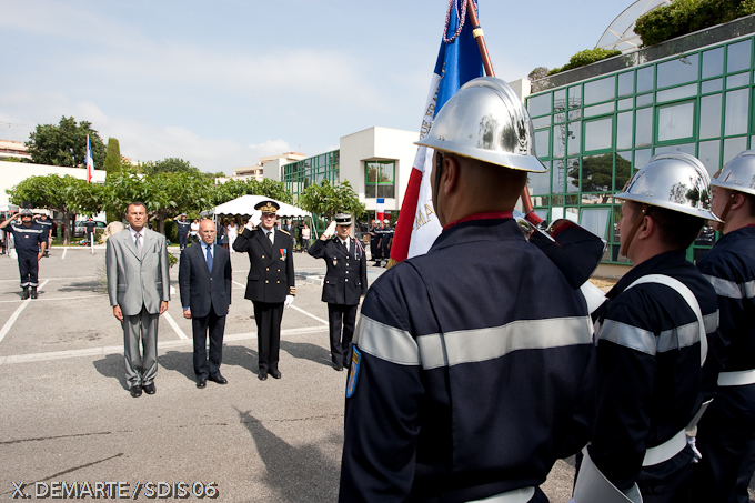 MM. Francis Lamy, Préfet, Eric Ciotti, Député, Président du Conseil général et Président du SDIS 06, le colonel Patrick Bauthéac, Directeur et Chef de Corps et Lionnel Luca, Député, vice président du Conseil général rendent hommage au drapeau du Corps départemental.