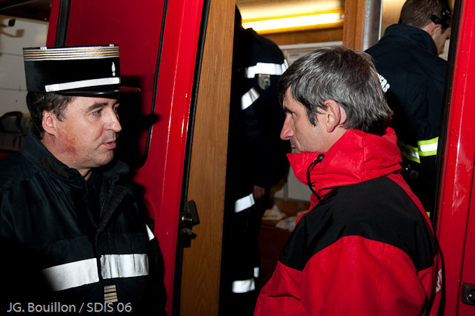 Le lieutenant colonel Erik Calatayud, chef du groupement territorial Est, commandant des opérations de secours et le médecin colonel Gilles Barrier préparent l'engagement du SSSM.