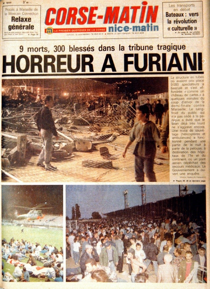 5 mai 1992, 20 H 20, à quelques minutes du coup d’envoi de la demi-finale de coupe de France de football, une tribune métallique du stade de Furiani en Corse s’écroulait.
